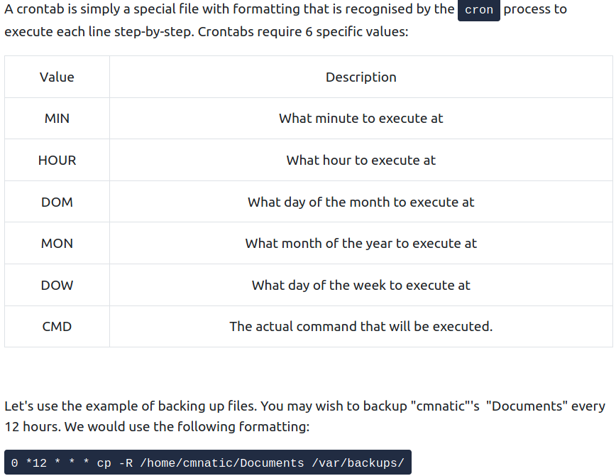 6 fields: MIN, HOUR, DOM, MON, DOW, CMD.