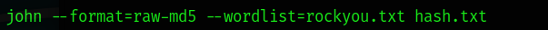 john --format=raw-md5 --wordlist=rockyou.txt hash1.txt