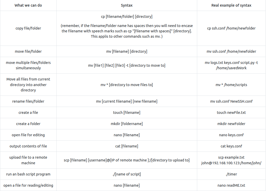- A few additional things to remember is that occasionally you may encounter files/folders with special characters such as - (dash). Just remember that if you try to copy or move these files you will encounter errors because Linux interprets the - as a type of argument, therefore you will have to place – just before the filename. For example:
