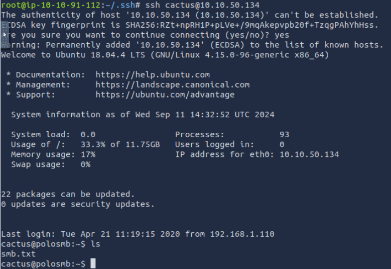 ssh cactus@ip, having the private key saved on your machine
