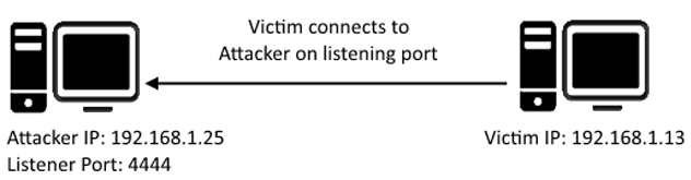 - The attacking machine has a listening port, on which it receives the connection, resulting in code or command execution being achieved.