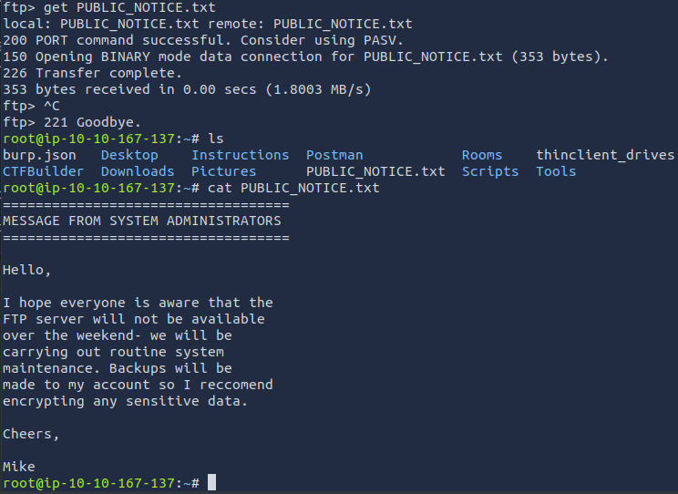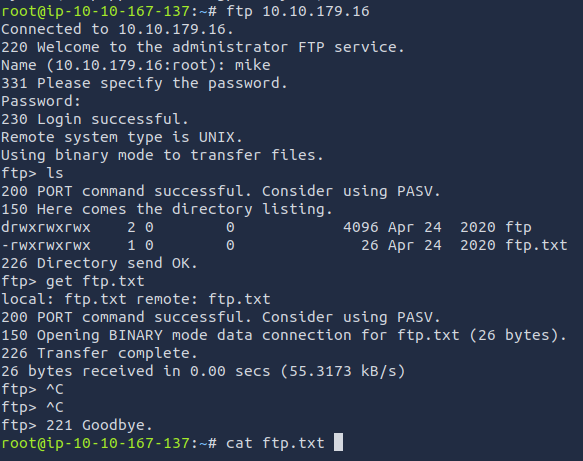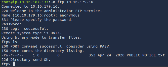 Great, now we know what type of FTP server we’re dealing with we can check to see if we are able to login anonymously to the FTP server. We can do this using by typing “ftp [IP]” into the console, and entering “anonymous”, and no password when prompted.
