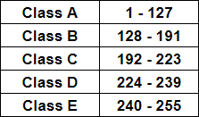 - IP Address Classes (NOTE: if you look on the first terms of the ranges, the difference between two consecutive ones is 2^7-1, then 2^6, 2^5 and 2^4)