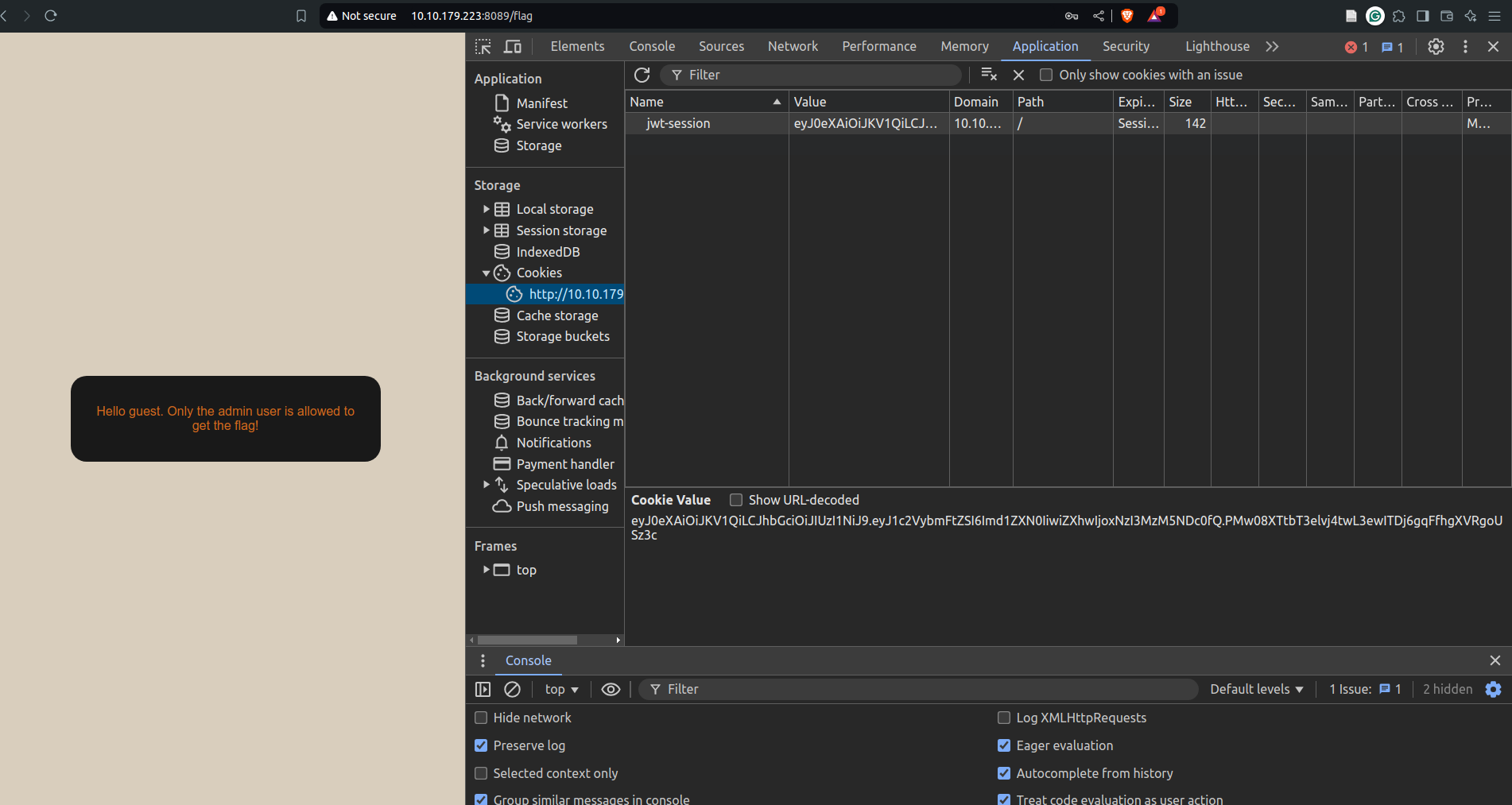 eyJ0eXAiOiJKV1QiLCJhbGciOiJub25lIn0=.eyJ1c2VybmFtZSI6ImFkbWluIiwiZXhwIjoxNzI3MzM5NDc0fQ==. - Paste this in the cookie value column and refresh the page