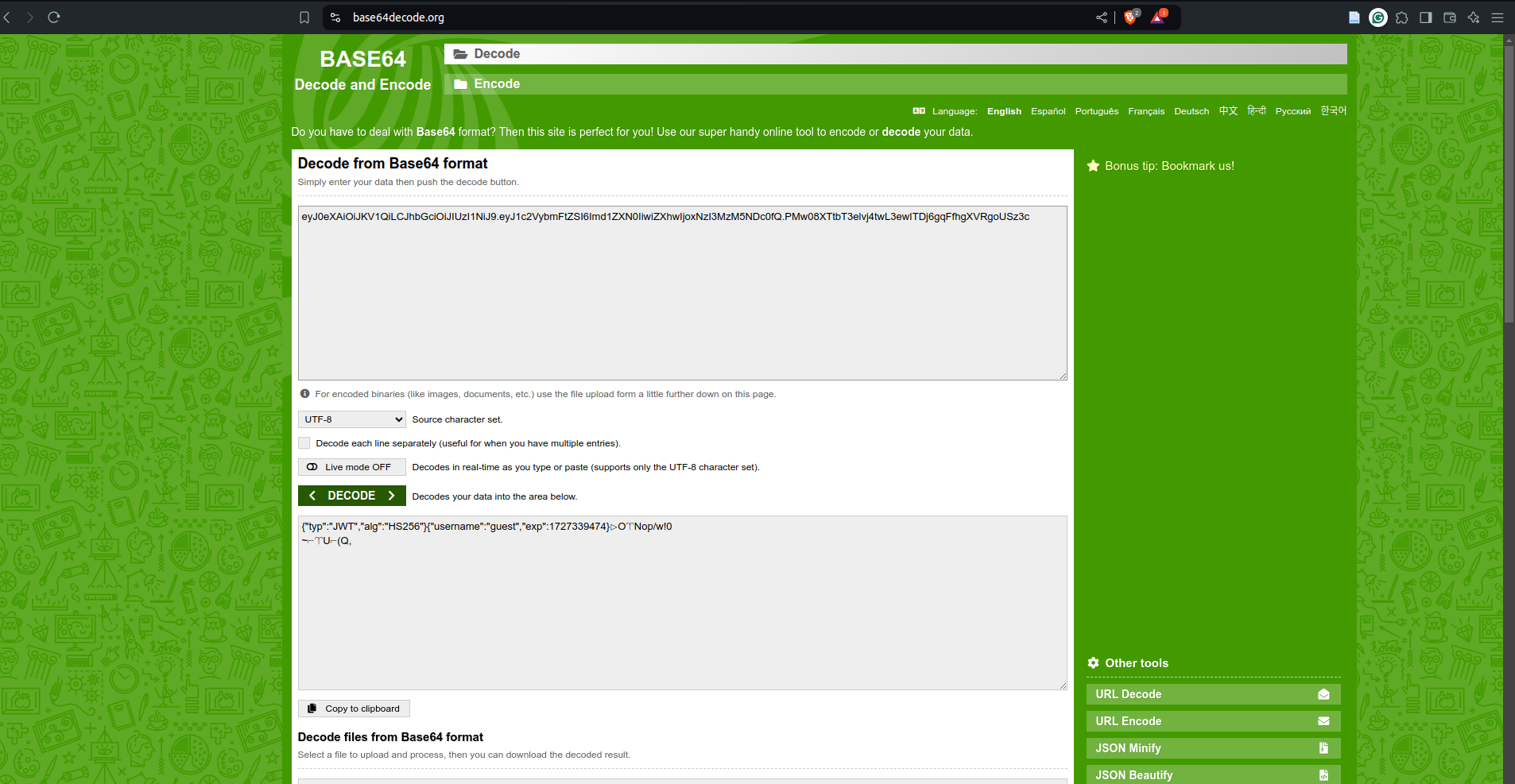 - Taking the JWT from before as an example, if we wanted to change the payload so that the username becomes “admin” and no signature check is done, we would have to decode the header and payload, modify them as needed, and encode them back.