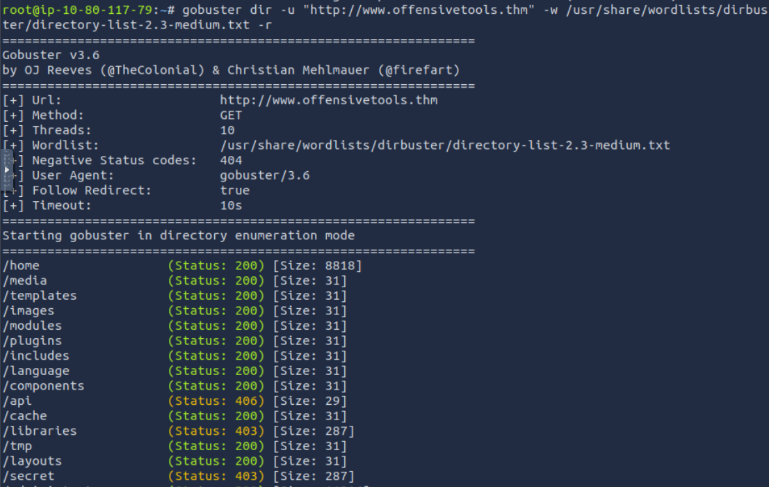 obuster dir -u "http://www.offensivetools.thm" -w /usr/share/wordlists/dirbuster/directory-list-2.3-medium.txt -r