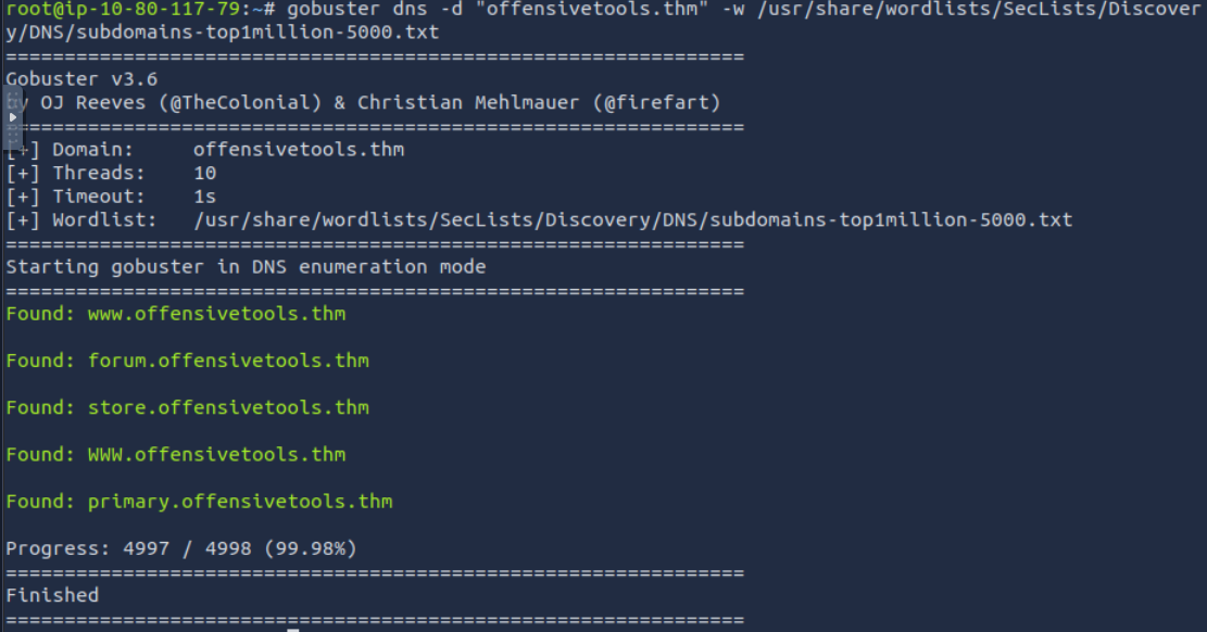 gobuster dns -d "offensivetools.thm" -w /usr/share/wordlists/SecLists/Discovery/DNS/subdomains-top1million-5000.txt