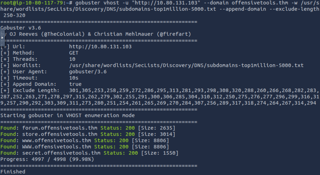 gobuster vhost -u "http://10.80.131.103" --domain offensivetools.thm -w /usr/share/wordlists/SecLists/Discovery/DNS/subdomains-top1million-5000.txt --append-domain --exclude-length 250-320