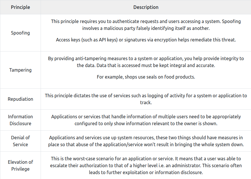 - STRIDE (Spoofing identity, Tampering with data, Repudiation threats, Information disclosure, Denial of Service and Elevation of privileges)