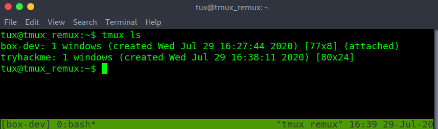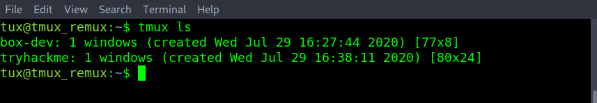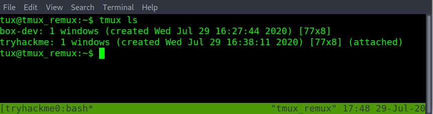 tmux attach -t tryhackme - The tmux session name has changed to the attached session of “tryhackme”. Double-checking with tmux ls. Can confirm that “(attached)” also on the “tryhackme” session name.