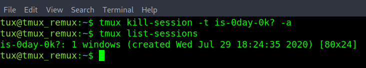 - From the five active sessions above. If there was a need to kill all the sessions except for a single one. When using the tmux kill-session. Use the -a argument to close all sessions except the one specified by the -t argument.