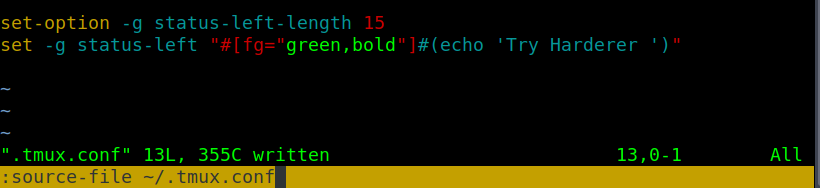 - The left side of the status bar can be customized with status-left within set or set-option. In the example below the first one status-left-length 15. Set the total amount of characters that can be shown on the left. The following line displays ‘Try Harderer’ with the echo Linux command.
