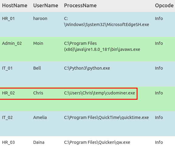 Q: Find the event that caused the alert and identify the user responsible for the process execution.