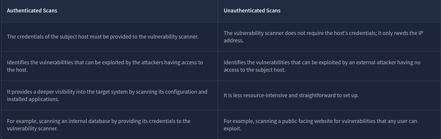 Authenticated scans require the subject host’s credentials and are more detailed than unauthenticated scans. These types of scans are helpful for discovering the threat surface within the host. However, unauthenticated scans are conducted without providing any credentials of the subject host. These scans help identify the threat surface from outside the host.