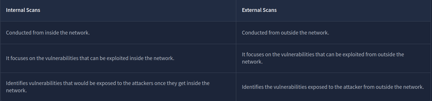 Internal scans are conducted from inside the network, while external scans are conducted from outside the network.