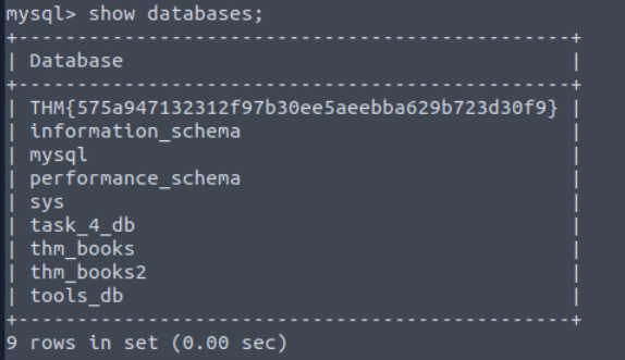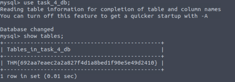 Q: In the list of available databases, you should also see the task_4_db database. Set this as your active database and list all tables in this database; what is the flag present here?