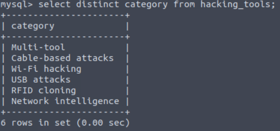 Q: Using the tools_db database, what is the total number of distinct categories in the hacking_tools table?