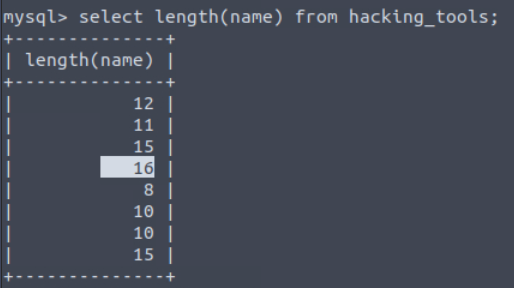 mysql> SELECT LENGTH(name) AS name_length FROM books;
