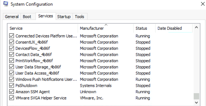 The Services tab lists all services configured for the system regardless of their state (running or stopped).
