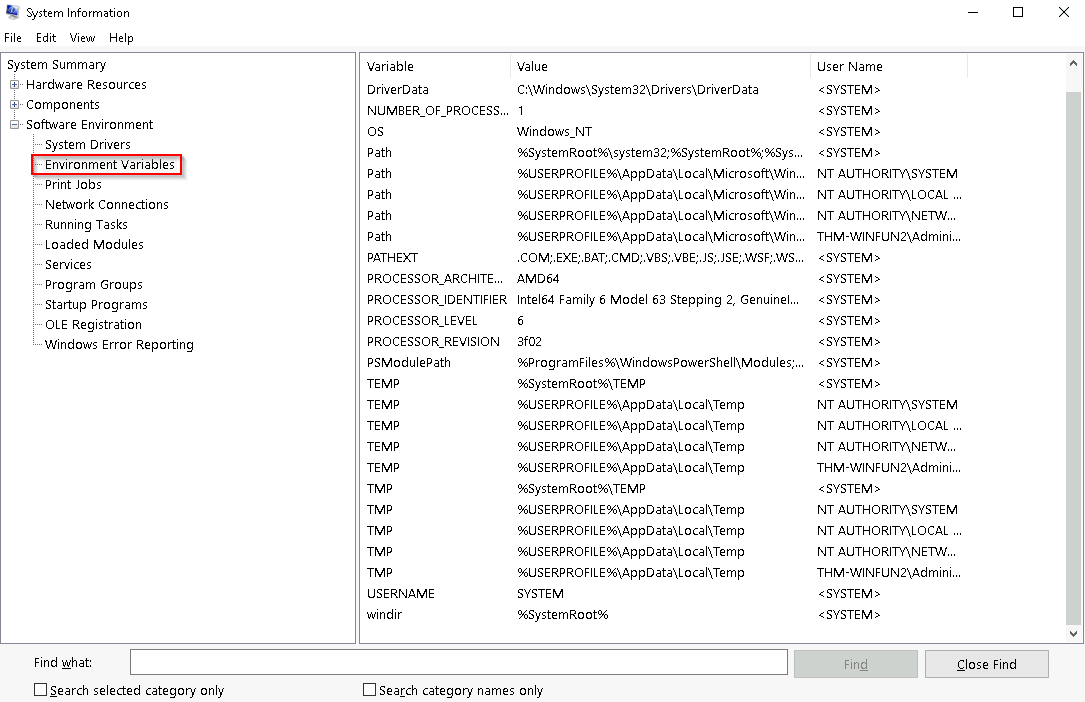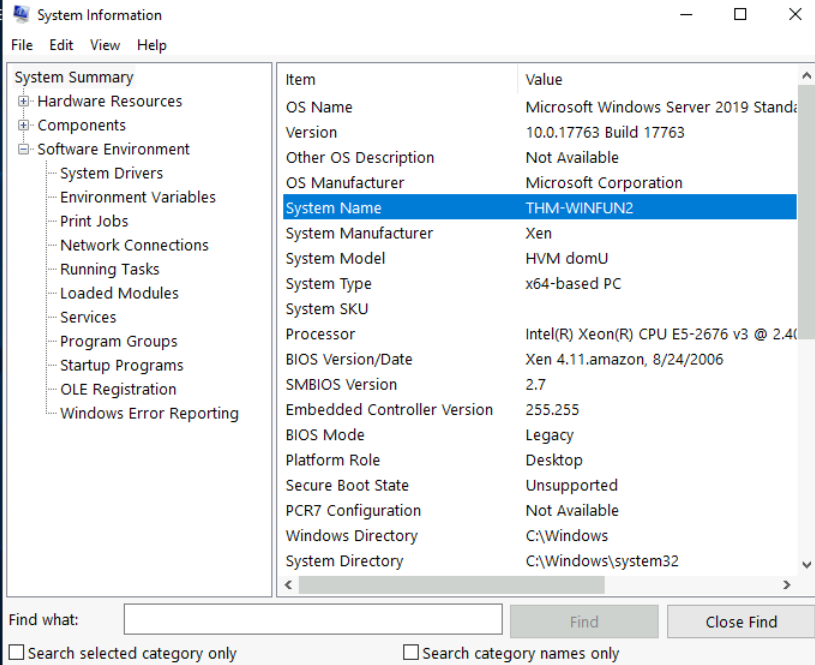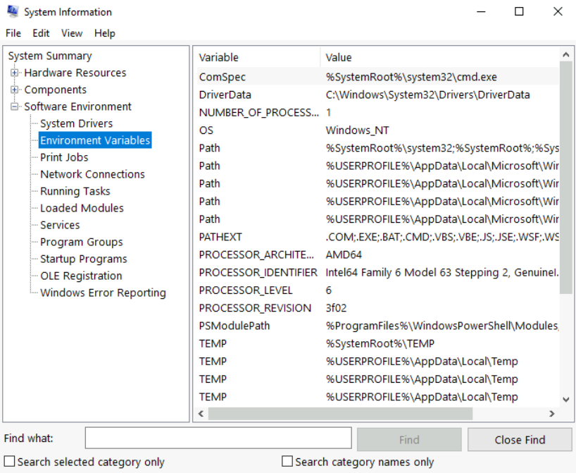 Per Microsoft, “Windows includes a tool called Microsoft System Information (Msinfo32.exe). This tool gathers information about your computer and displays a comprehensive view of your hardware, system components, and software environment, which you can use to diagnose computer issues.”