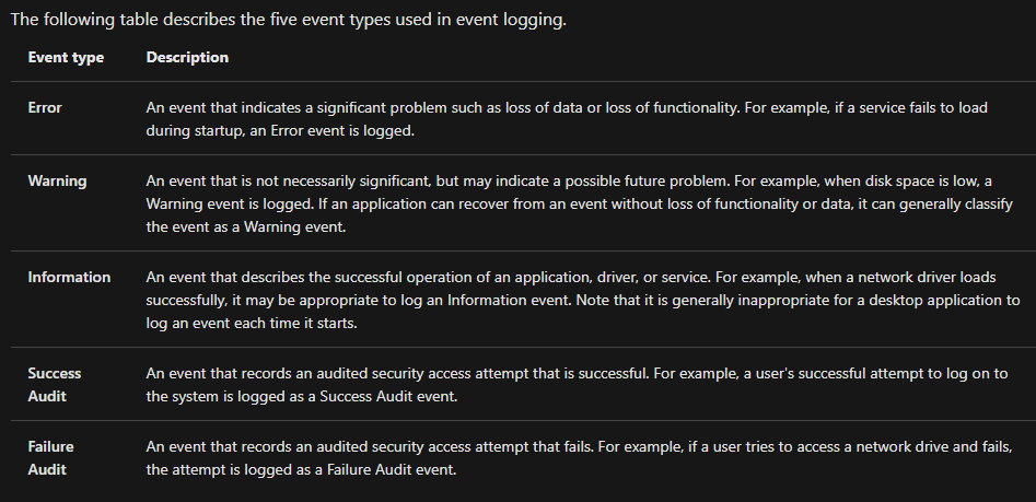 There are five types of events that can be logged.