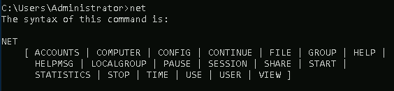 If you type net without a sub-command, the output will show the syntax for the root command showing a few of the sub-commands you can use.