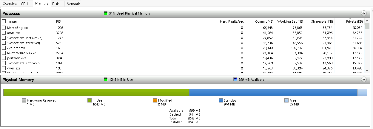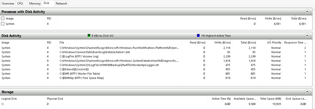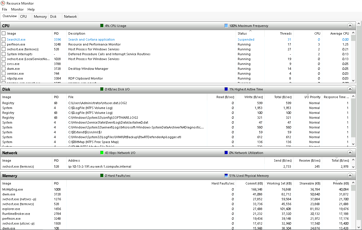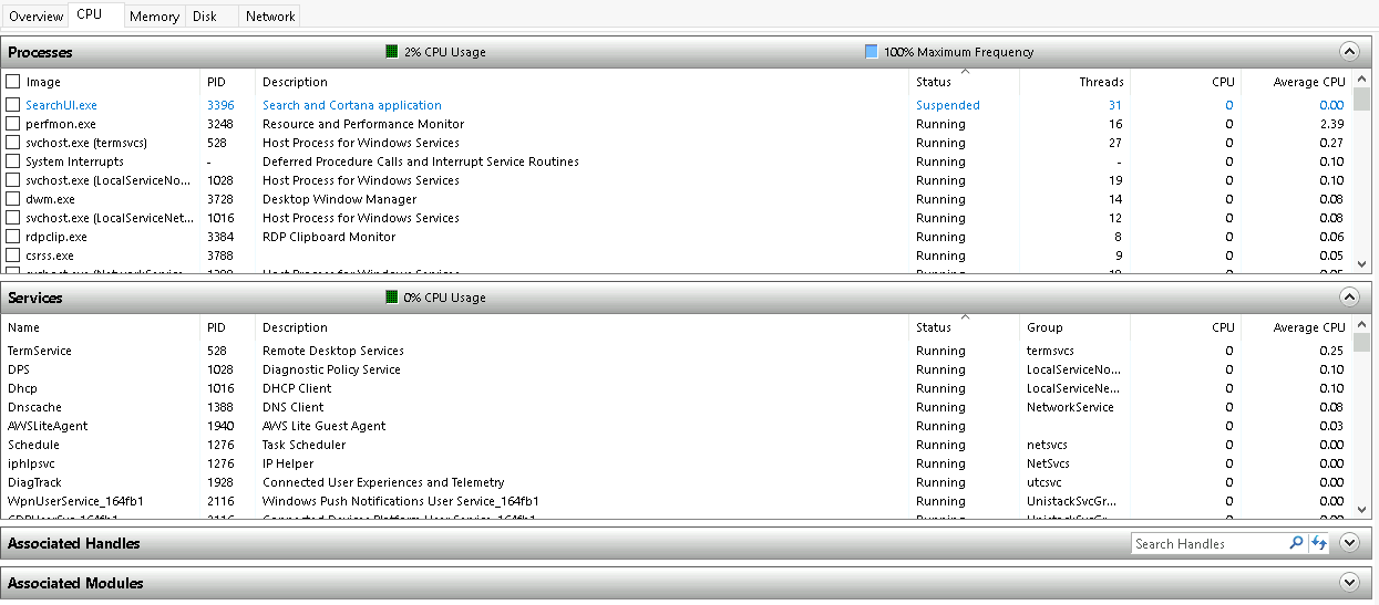 Per Microsoft, “Resource Monitor displays per-process and aggregate CPU, memory, disk, and network usage information, in addition to providing details about which processes are using individual file handles and modules. Advanced filtering allows users to isolate the data related to one or more processes (either applications or services), start, stop, pause, and resume services, and close unresponsive applications from the user interface. It also includes a process analysis feature that can help identify deadlocked processes and file locking conflicts so that the user can attempt to resolve the conflict instead of closing an application and potentially losing data.”