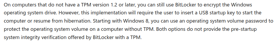 Per Microsoft, “BitLocker provides the most protection when used with a Trusted Platform Module (TPM) version 1.2 or later. The TPM is a hardware component installed in many newer computers by the computer manufacturers. It works with BitLocker to help protect user data and to ensure that a computer has not been tampered with while the system was offline”.