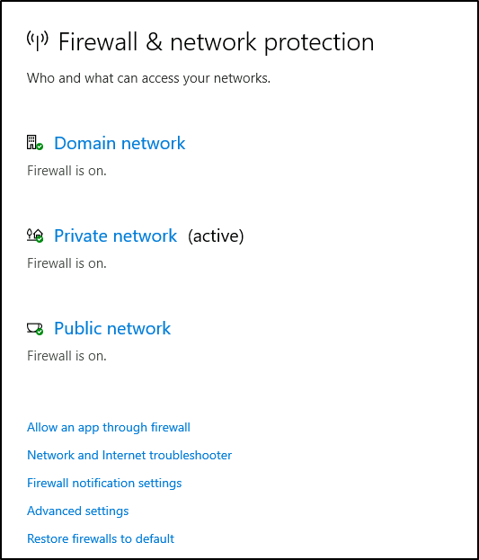 - The below image will reflect what you will see when you navigate to Firewall & network protection.