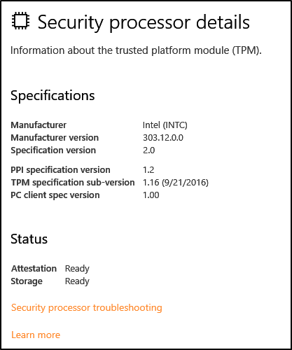 Per Microsoft, “Trusted Platform Module (TPM) technology is designed to provide hardware-based, security-related functions. A TPM chip is a secure crypto-processor that is designed to carry out cryptographic operations. The chip includes multiple physical security mechanisms to make it tamper-resistant, and malicious software is unable to tamper with the security functions of the TPM”.