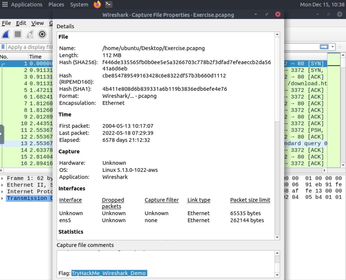 Knowing the file details is helpful. Especially when working with multiple pcap files, sometimes you will need to know and recall the file details (File hash, capture time, capture file comments, interface and statistics) to identify the file, classify and prioritise it. You can view the details by following “Statistics –> Capture File Properties” or by clicking the “pcap icon located on the left bottom”.