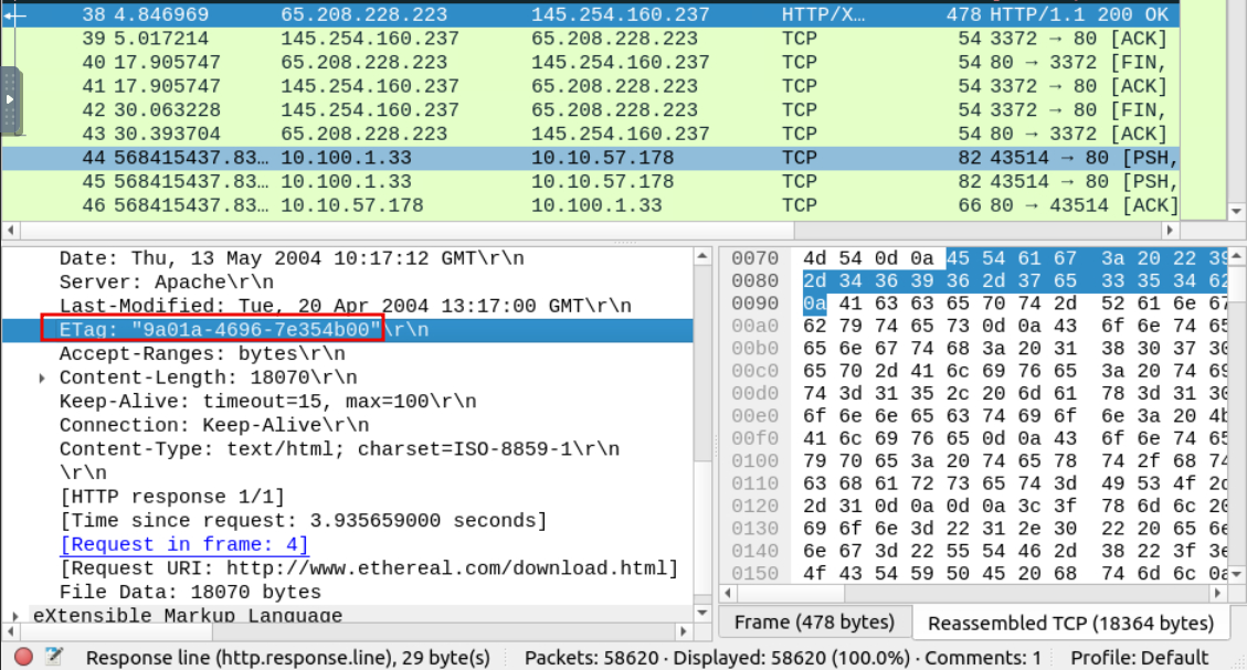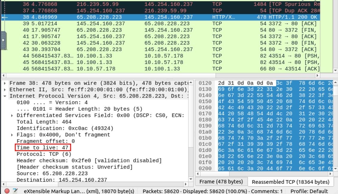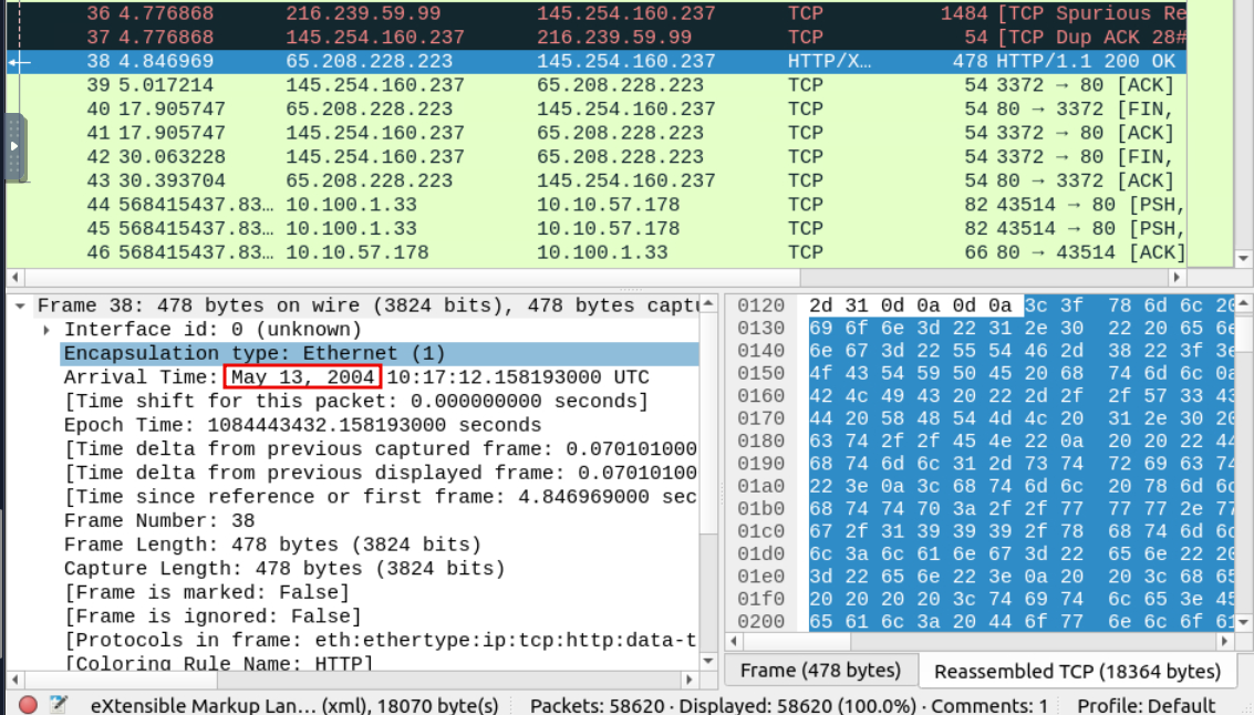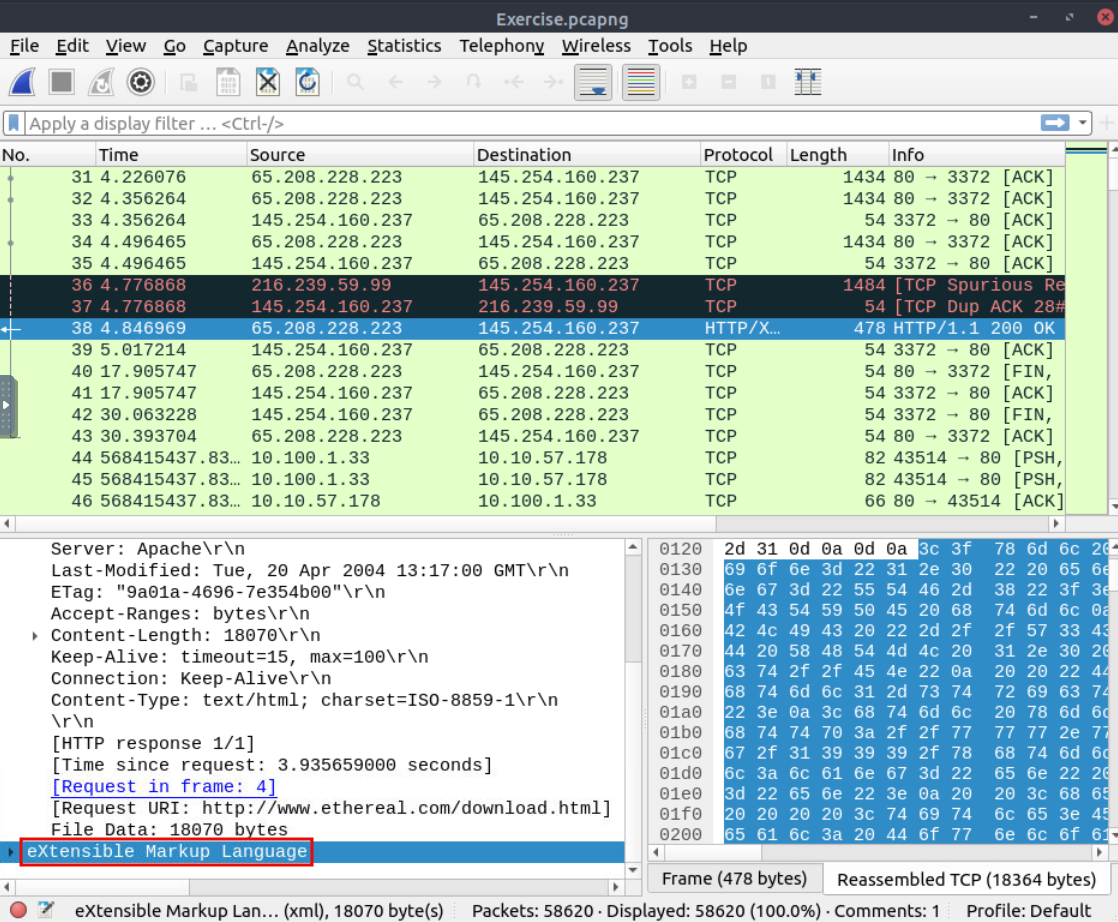 Q: Use the “Exercise.pcapng” file to answer the questions. View packet number 38. Which markup language is used under the HTTP protocol?
