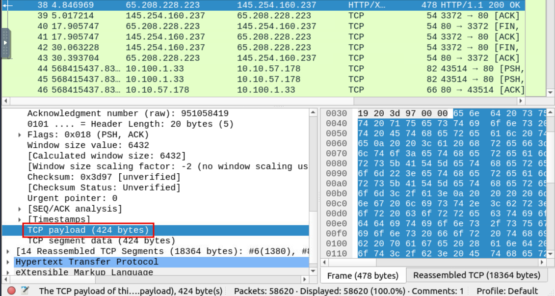 Wireshark displays everything in packet portion size. However, it is possible to reconstruct the streams and view the raw traffic as it is presented at the application level. Following the protocol, streams help analysts recreate the application-level data and understand the event of interest. It is also possible to view the unencrypted protocol data like usernames, passwords and other transferred data.