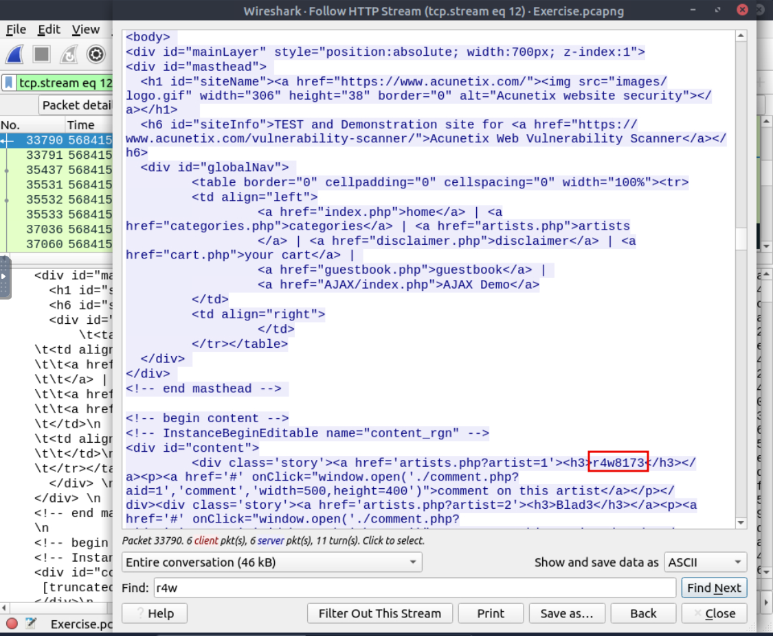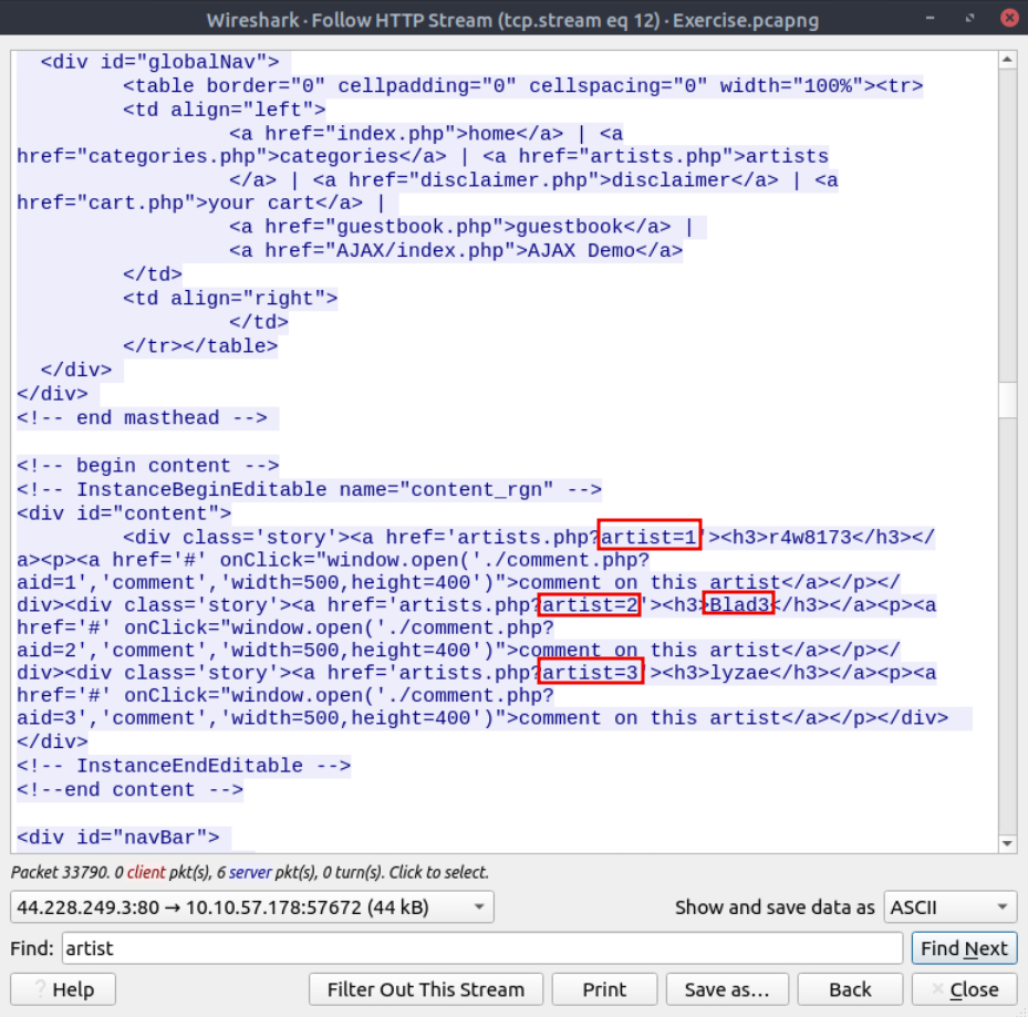 Q: Use the “Exercise.pcapng” file to answer the questions. Search the “r4w” string in packet details. What is the name of artist 1?
