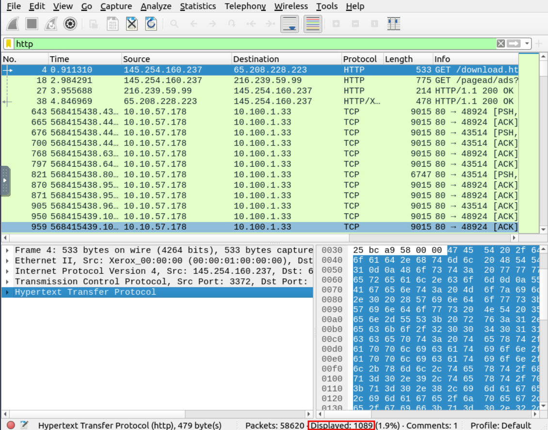 This is the most basic way of filtering traffic. While investigating a capture file, you can click on the field you want to filter and use the ”right-click menu” or “Analyse –> Apply as Filter” menu to filter the specific value. Once you apply the filter, Wireshark will generate the required filter query, apply it, show the packets according to your choice, and hide the unselected packets from the packet list pane. Note that the number of total and displayed packets are always shown on the status bar.