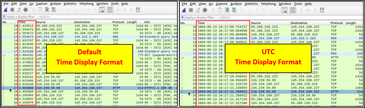 Wireshark lists the packets as they are captured, so investigating the default flow is not always the best option. By default, Wireshark shows the time in “Seconds Since Beginning of Capture”, the common usage is using the UTC Time Display Format for a better view. You can use the “View –> Time Display Format” menu to change the time display format.